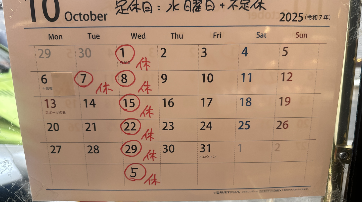 【10月の店休日のお知らせ】