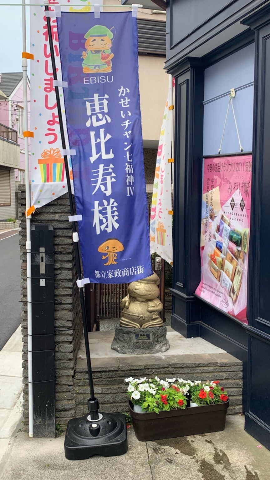 漫画家のちばてつや先生が考案した都立家政商店街のマスコットキャラクターのかせいチャンをデフォルメした、かせいチャン七福神の恵比寿さまが当店前に移設されました。