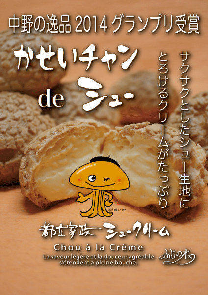 漫画家のちばてつや先生が考案した都立家政のマスコットキャラクターの「かせいチャン」のスイーツです。サクサクのシュー皮にクリームがたっぷり。