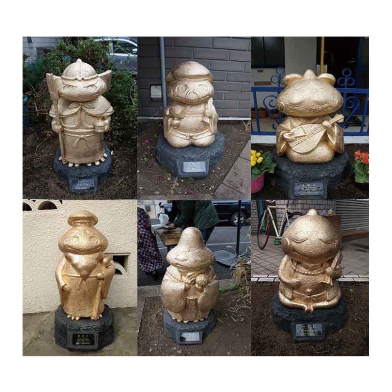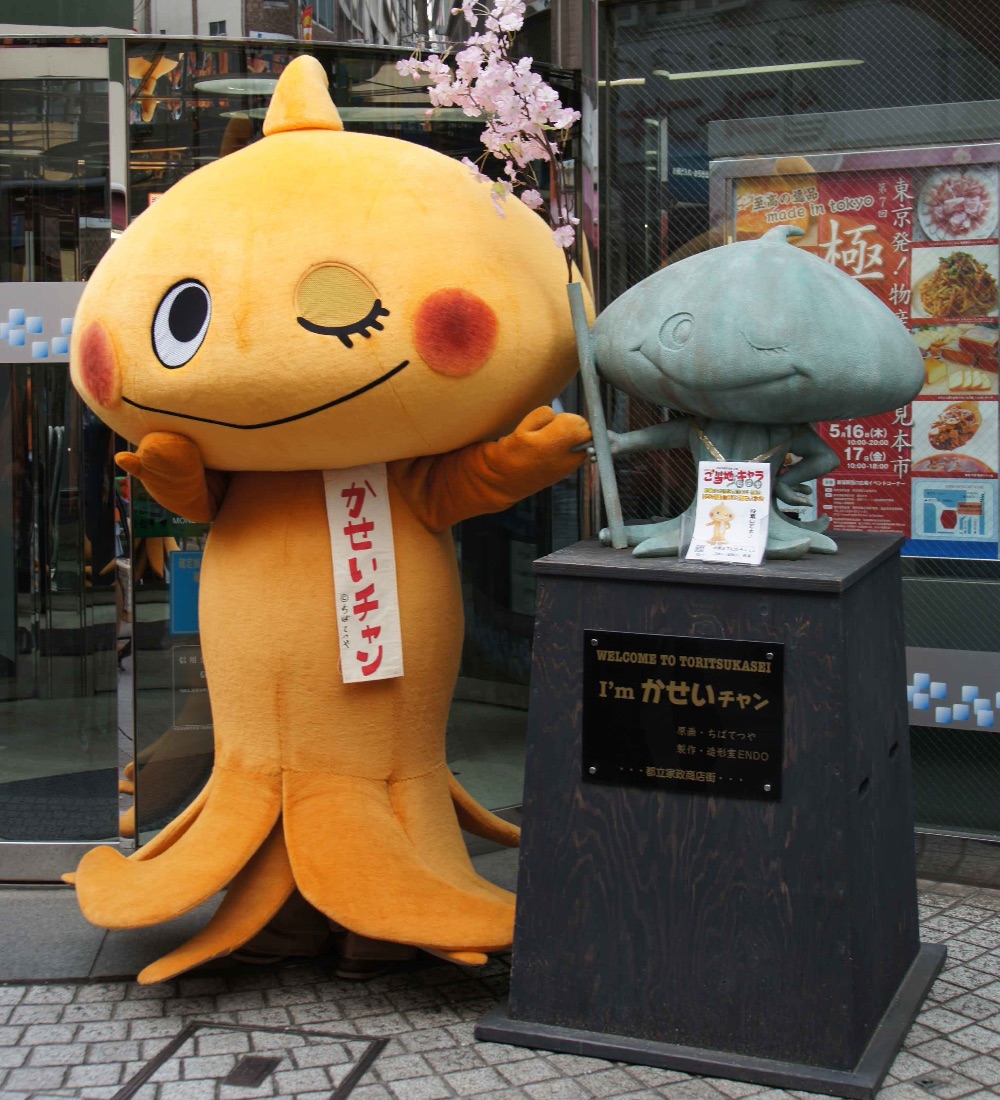 平成14年に都立家政商店街の新しい街路灯と道路舗装が完成したのを記念して、漫画家のちばてつや氏に依頼して誕生しました。平成23年7月「かせいチャンモニュメント」が完成。ちばてつや氏をお招きして除幕式とサイン会を行いました。翌平成24年には、ゆるキャラの「かせいチャン」が誕生。平成25年には「かせいチャン七福神」像が完成し、商店街周辺に設置されました。